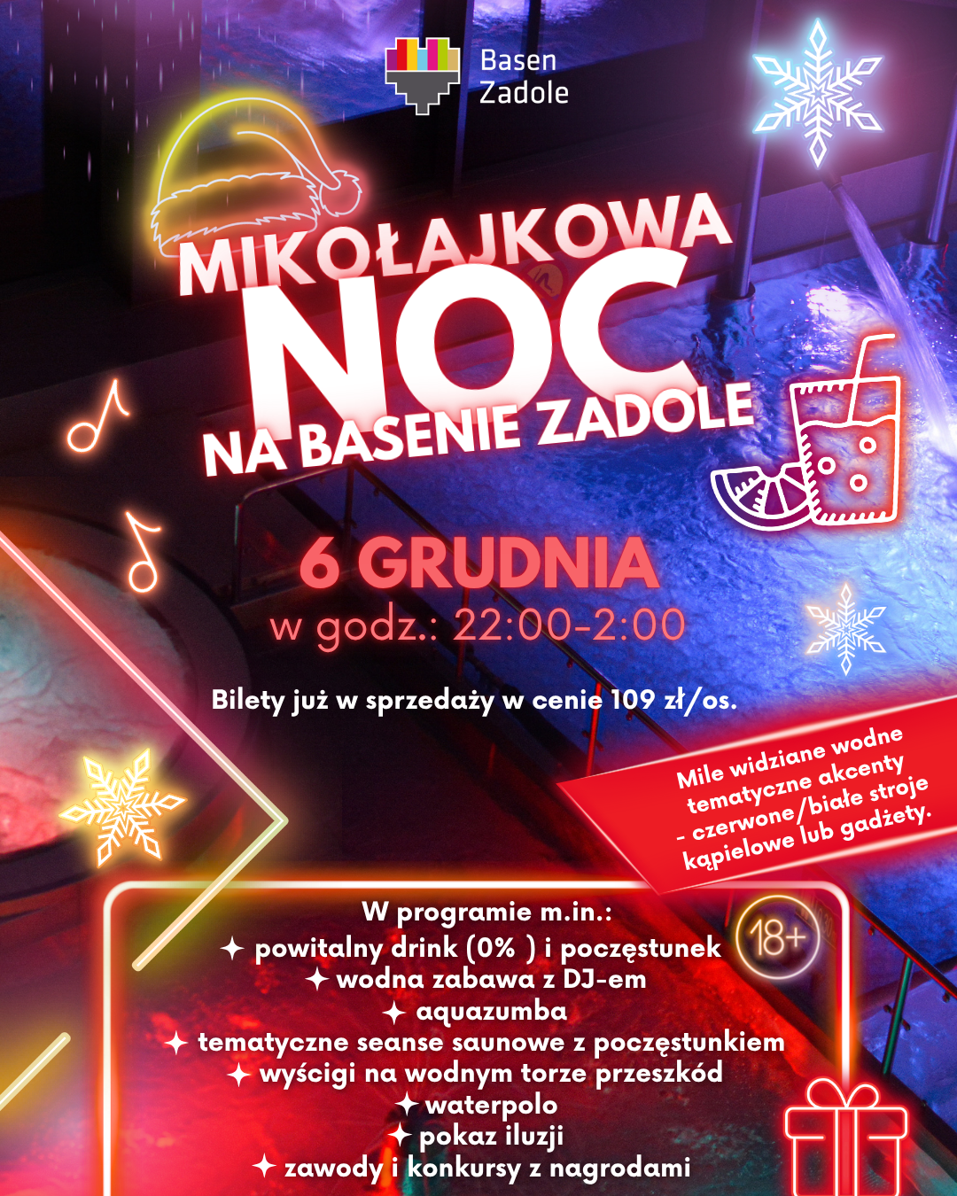 Po raz pierwszy w historii naszych obiektów zapraszamy Was na wyjątkowe wydarzenie - Mikołajkową Noc na Basenie, która odbędzie się 6 grudnia na Basenie Zadole!